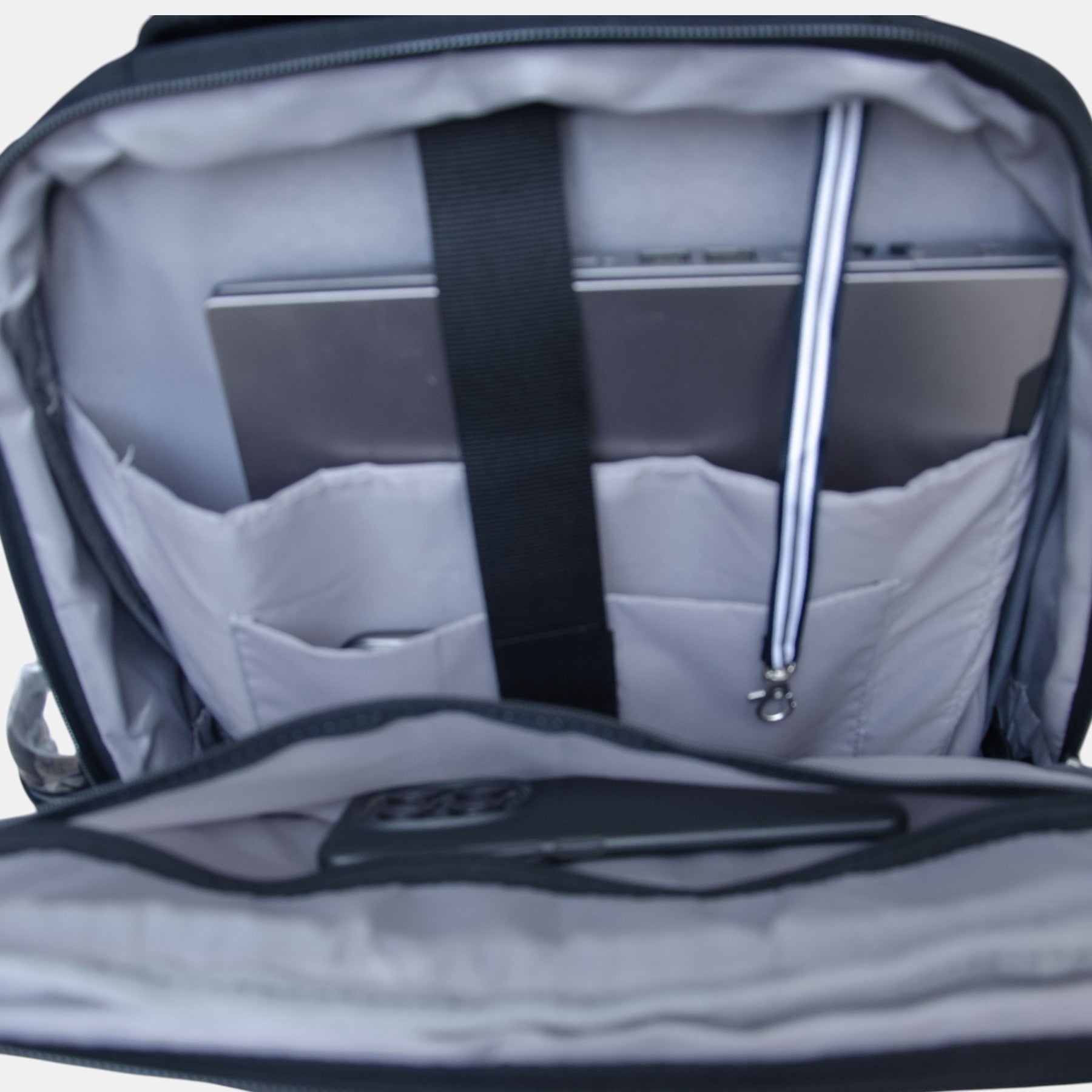 - Astarlı ana bölme içinde bir fermuarlı bölme, mat destekli laptop bölmesi, tablet bölmesi, bir powerbank usb girişi mevcuttur. Powerbankınızı çantanın içindeki göze yerleştirip entegre usb girişine iç taraftan kablo ile bağlayabilirsiniz.